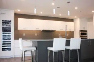 To warm up a modern kitchen, it’s all about adding light. A glossy finish on cabinets bounces light back into the room.